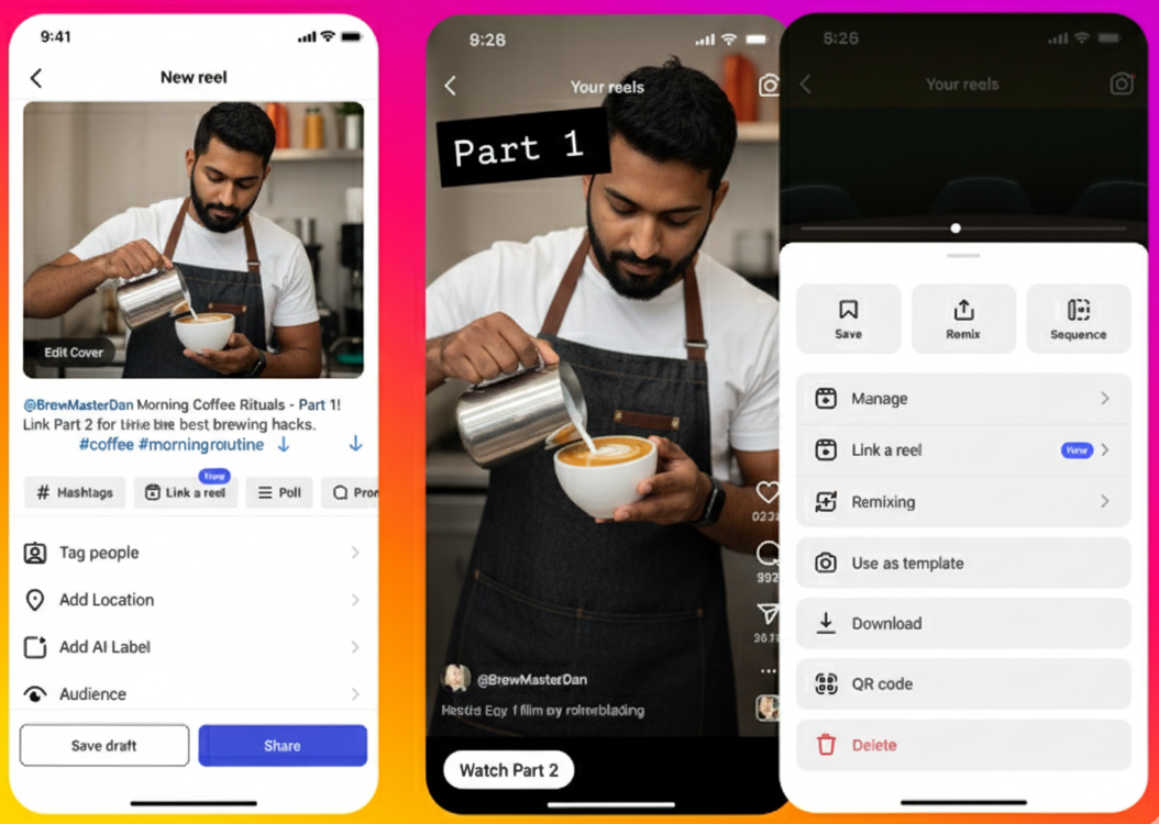 - Creación y enlace: al subir un Reel, los creadores ahora tienen la opción de añadir un enlace directo a otro Reel ya publicado en su perfil. Este enlace genera el botón de llamada a la acción "Watch Part 2" (o similar).