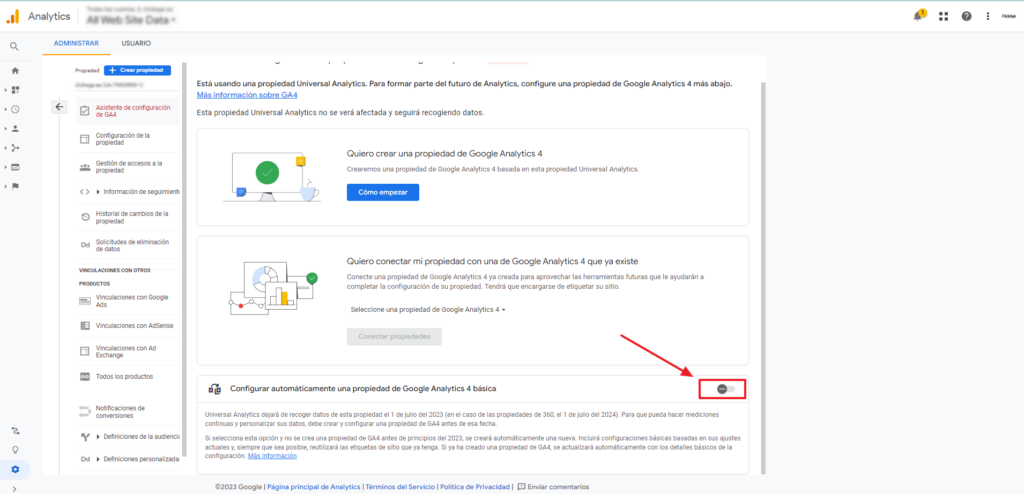 Para ello, no te olvides de desactivar esta opción. El procedimiento es muy sencillo. Solo tienes que acceder al área de administración de Universal Analytics y seleccionar la propiedad y cuenta correctas. Después, en la columna de “propiedad”, tendrás que seleccionar “asistente de configuración de GA4” y, finalmente, desactivar el botón “configurar automáticamente una propiedad de Google Analytics básica”.