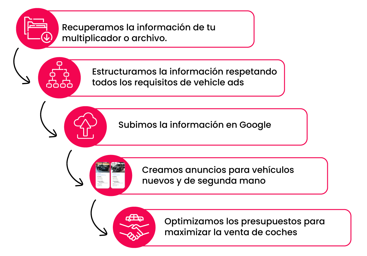 Para sacar el máximo rendimiento a este formato, es esencial la gestión de inventario online, ya que los concesionarios dependen de plataformas como Google y otros portales para dar salida a su stock de vehículos. Los anuncios de Vehicle Ads son muy similares a Google Shopping, y requieren que se suba el feed de datos del inventario (un archivo con información crucial como precio, estado, marca y modelo) a través de Google Merchant Center.